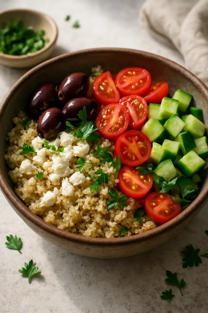 ⏱️ 15 MinutesThis colorful bowl combines pre-cooked quinoa with fresh vegetables and feta cheese. Mediterranean flavors satisfy completely.